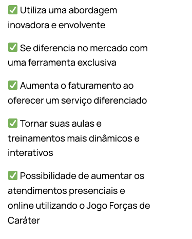 Aplicar o Jogo Forças de Caráter em diversos contextos, como dinâmicas de grupo, fortalecimento de equipes, mentorias e atendimento individuais.